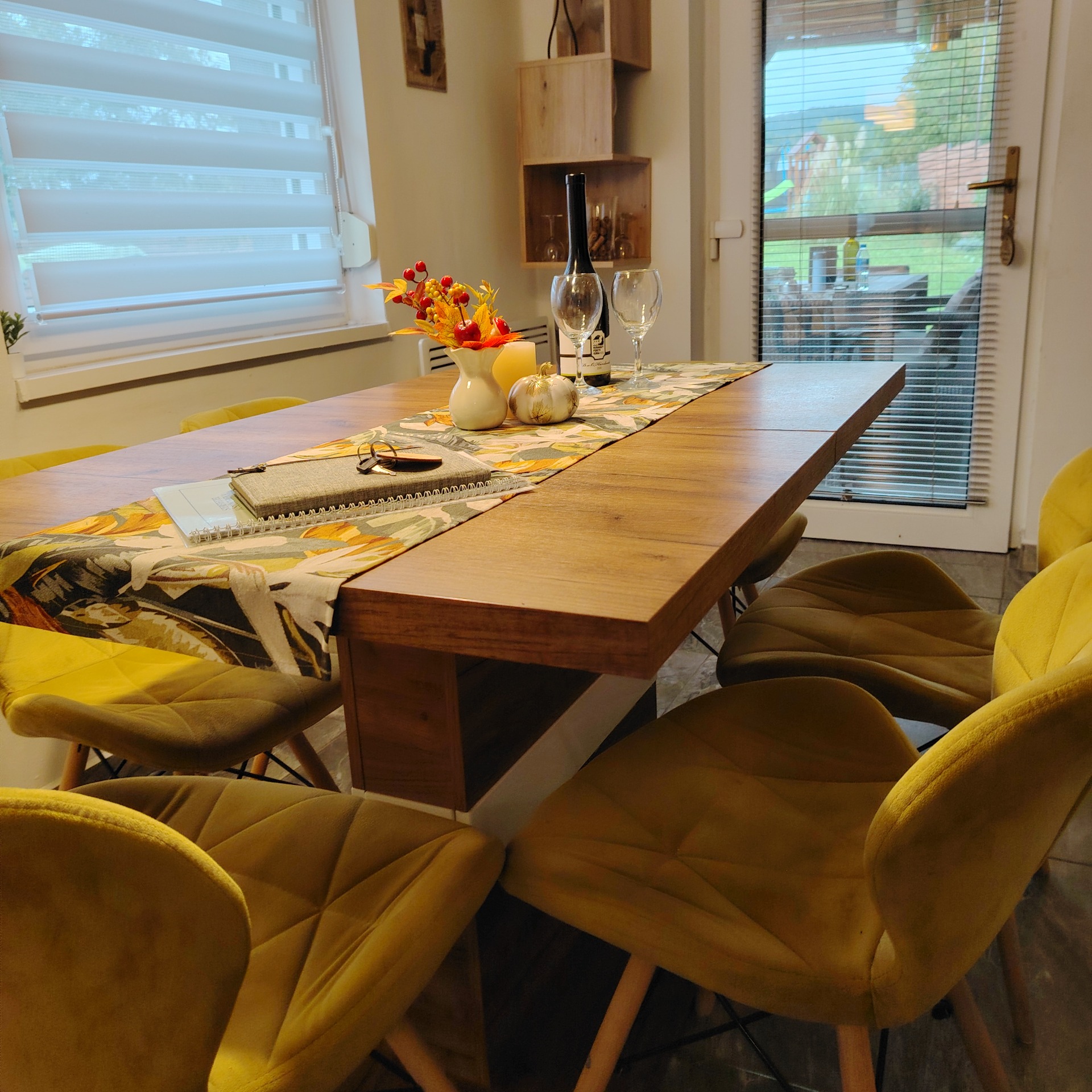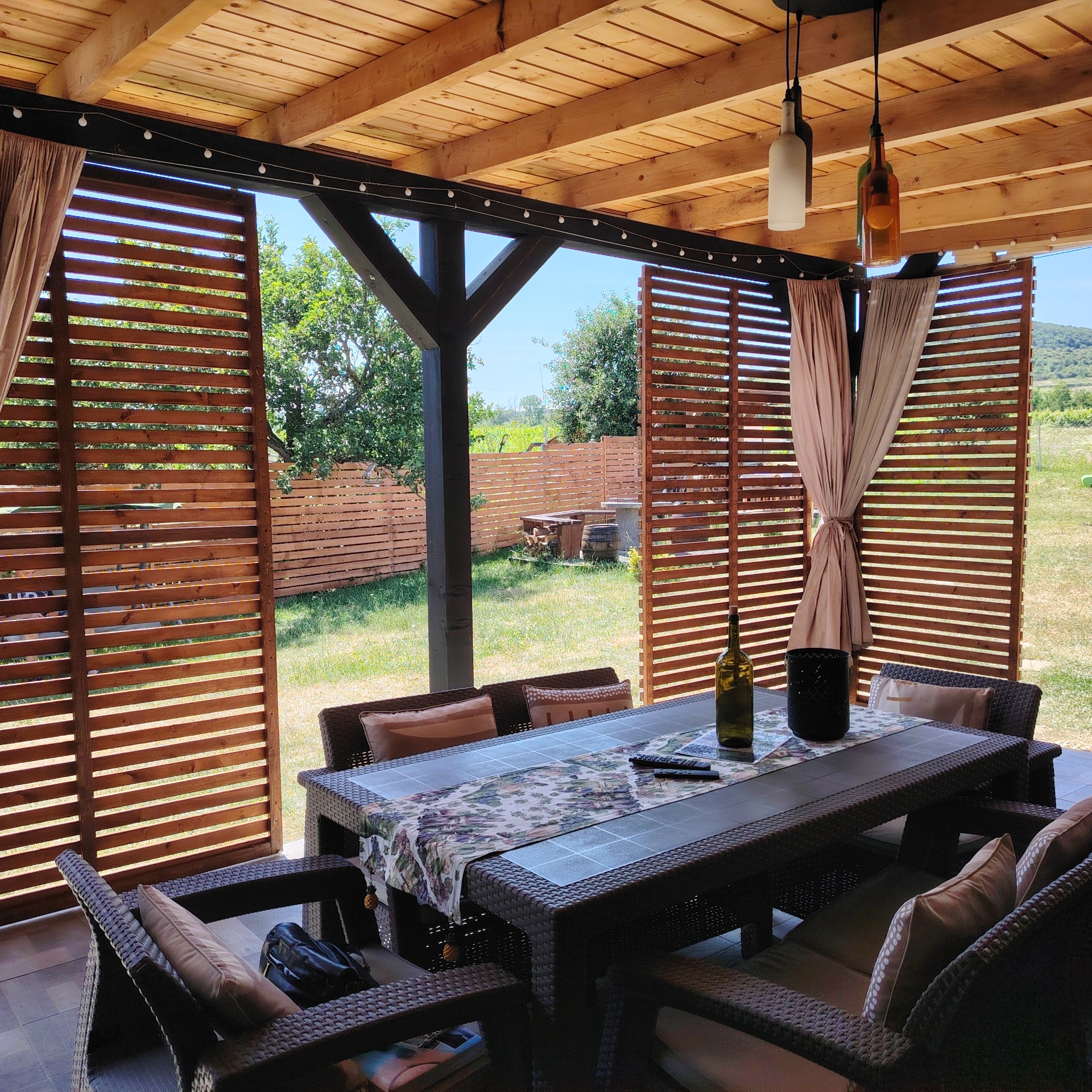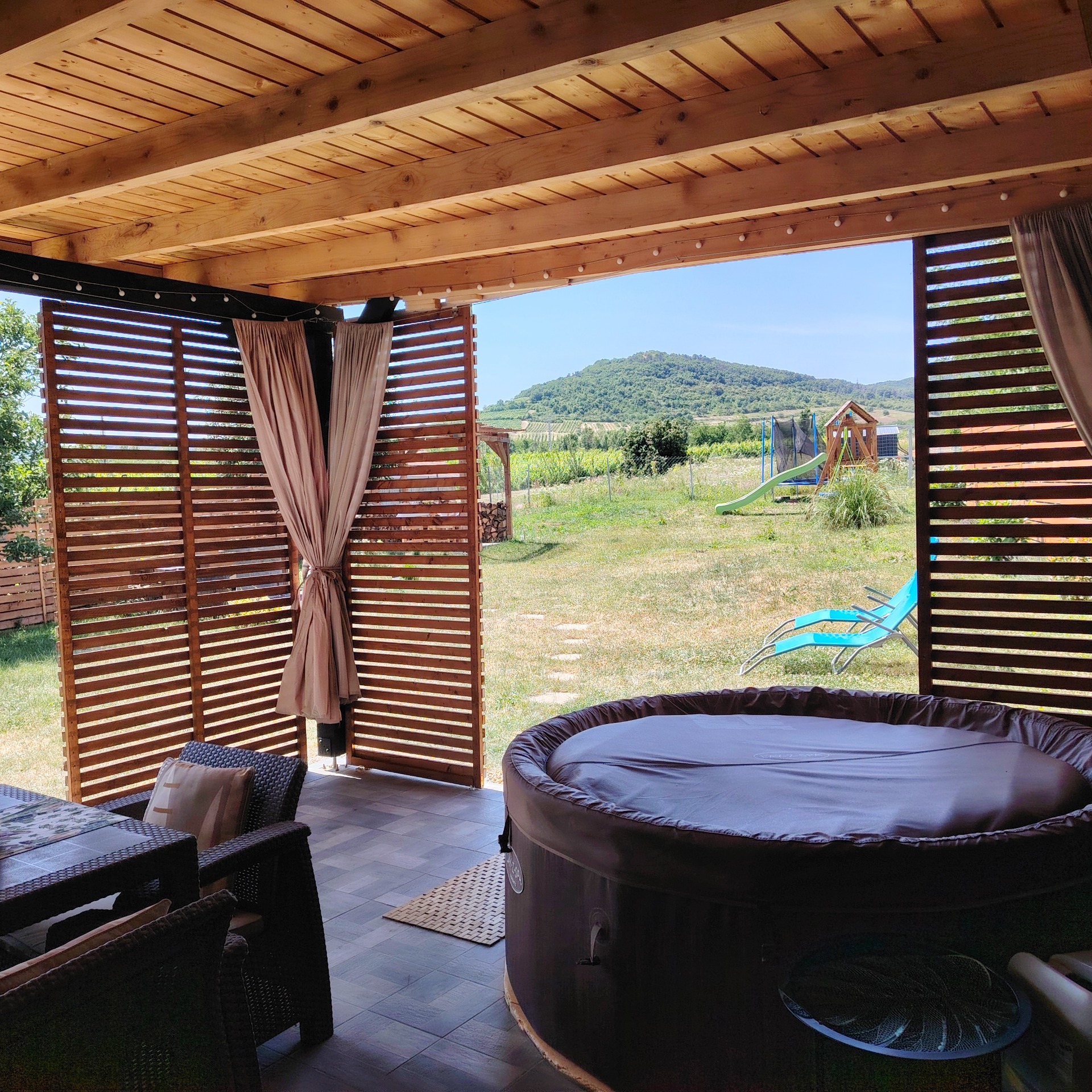30nm-es terasz, csodás panorámával a Zempléni hegyekre, itt kapott helyet a 6 személyes jakuzzi (felár nélkül használható) a kényelmes kerti bútor,függő szék és a darts tábla.