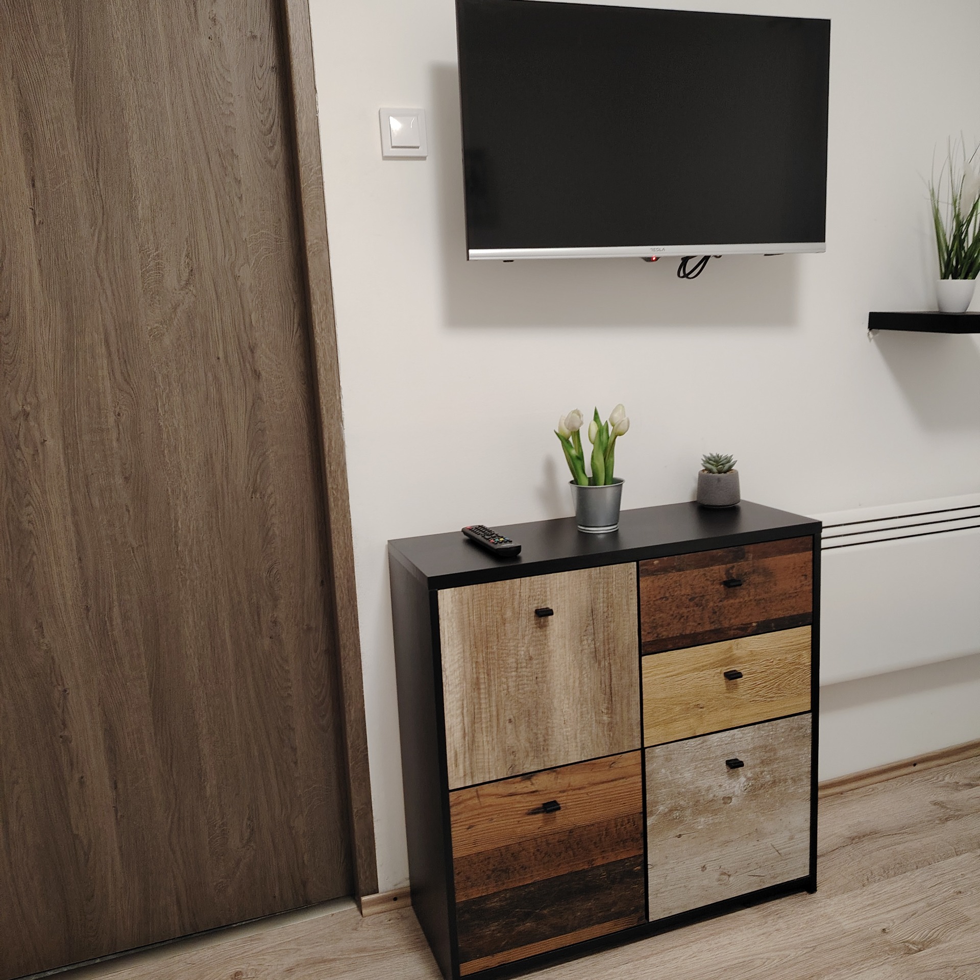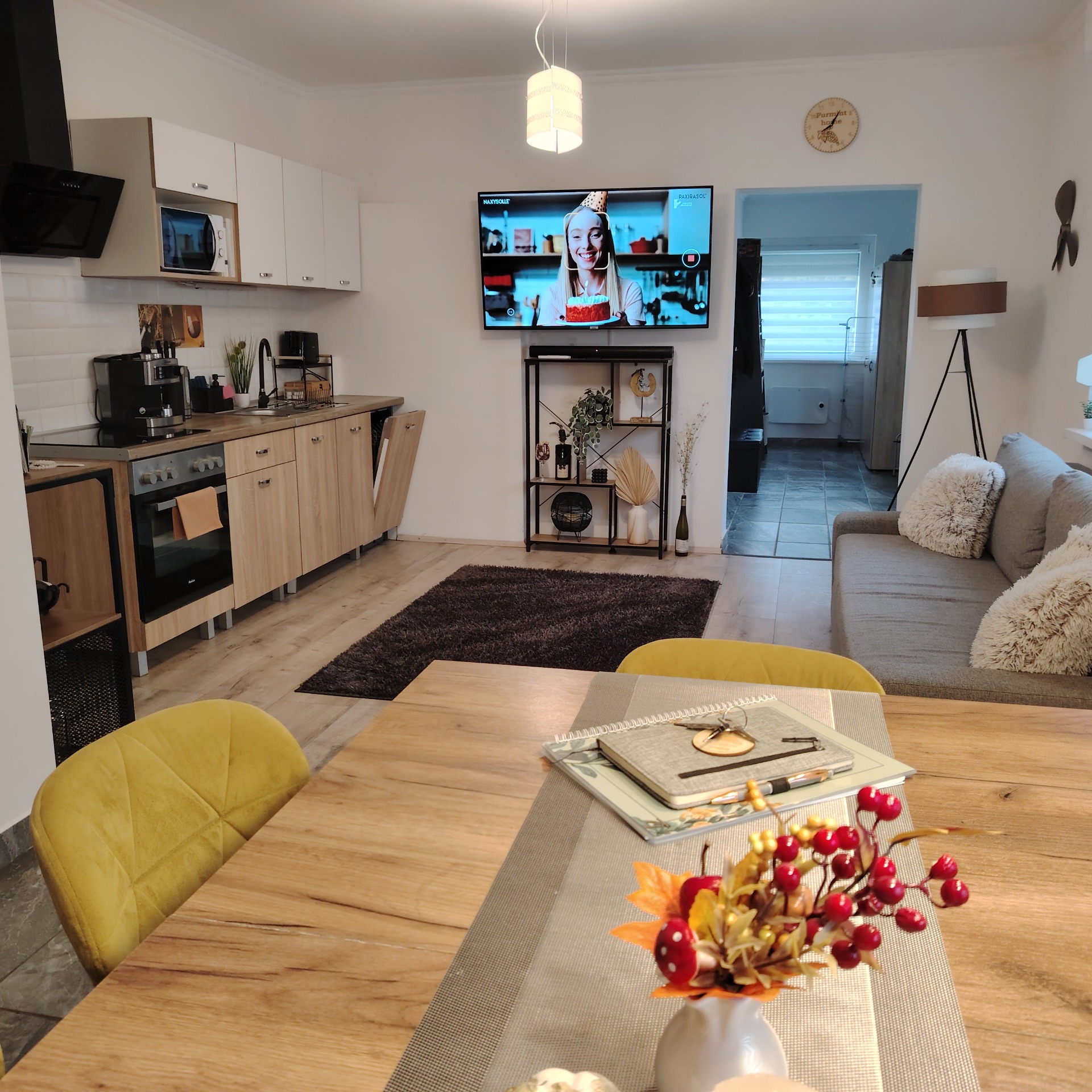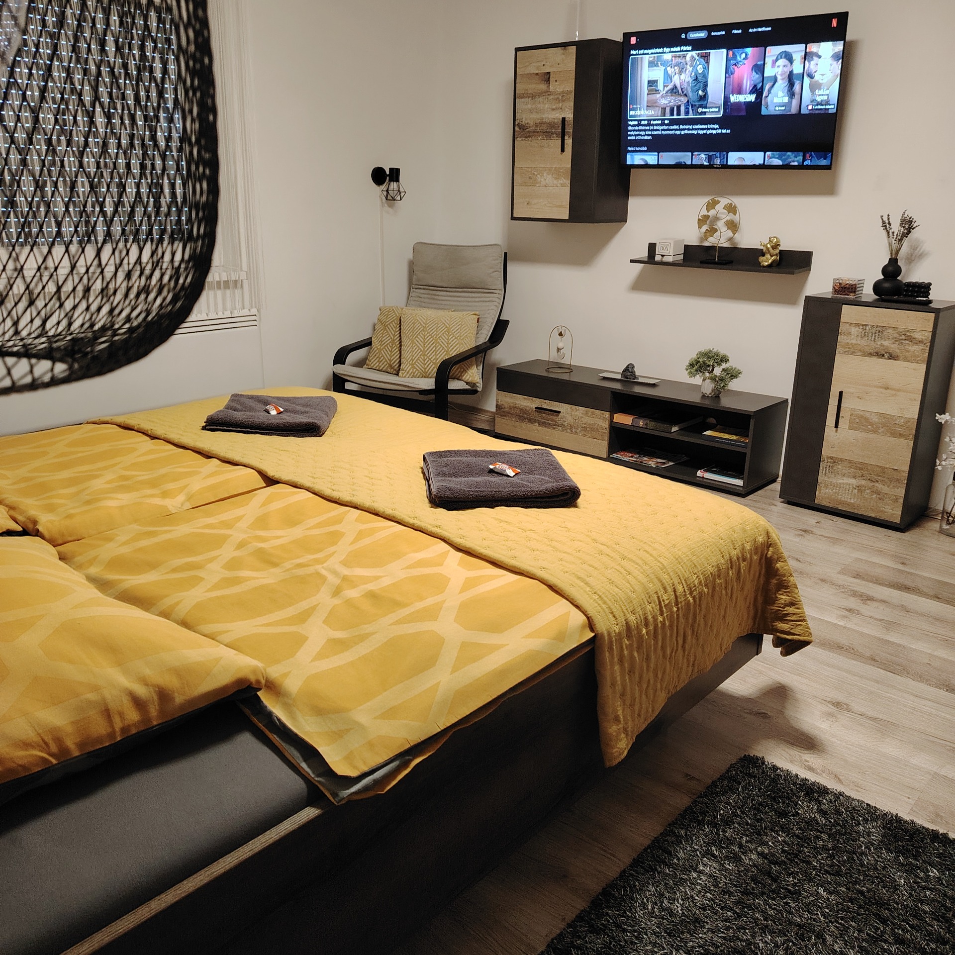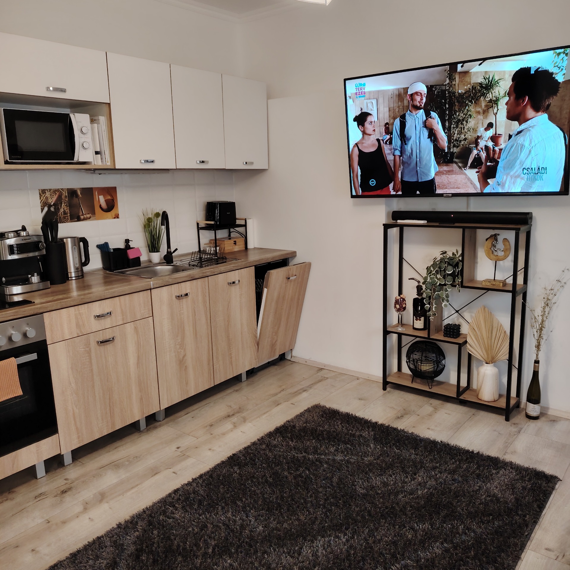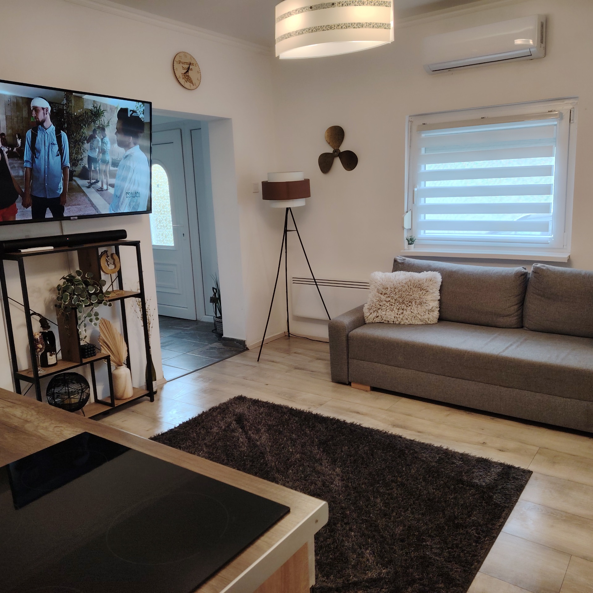Kihúzható 2 személyes kanapé, nagyképernyős okos tv hangfallal.